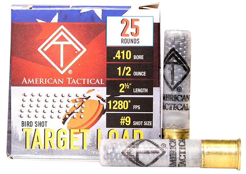 ATI Target Load shotshells in 410 gauge feature a 2.5" casing with 1/2 oz of #9 shot for target shooting and sporting applications. These rounds deliver 1280 fps muzzle velocity and come 25 per box, ideal for clay shooting and range practice.