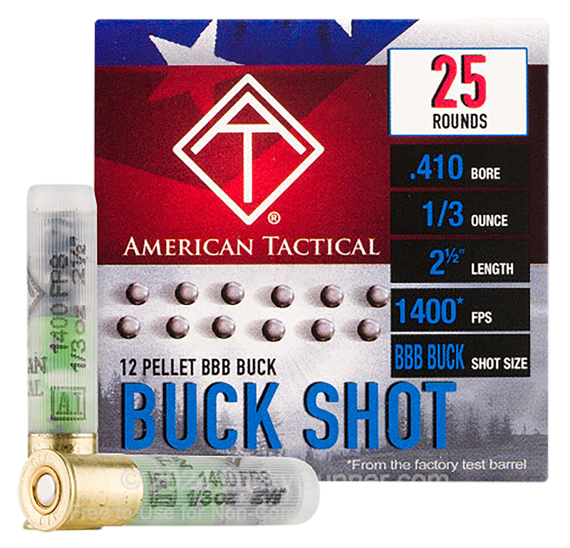 ATI .410 bore buckshot load featuring BBB shot with a 1/3 oz payload and 12 pellets per round. This ammunition is designed for close-range defense applications and delivers 1400 fps muzzle velocity.