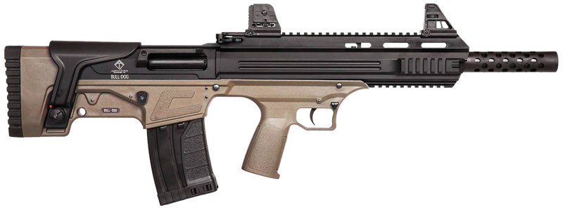 The ATI Bulldog is a 410 Gauge semi-automatic shotgun with a 3" chamber, 18.5" barrel, and 5+1 capacity in a bullpup configuration. It features a tan aluminum receiver with tactical stock, adjustable cheek rest, and Picatinny/M-LOK rail for accessories. Includes three choke tubes and open sights.