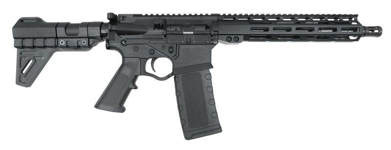 Semi-auto specialty rifle with 10.5" threaded barrel and 30+1 round capacity. Features a black receiver with Picatinny rail, M-LOK handguard, and black polymer grip and brace. Measures 28.2" overall length with a compact profile suitable for specialized applications.