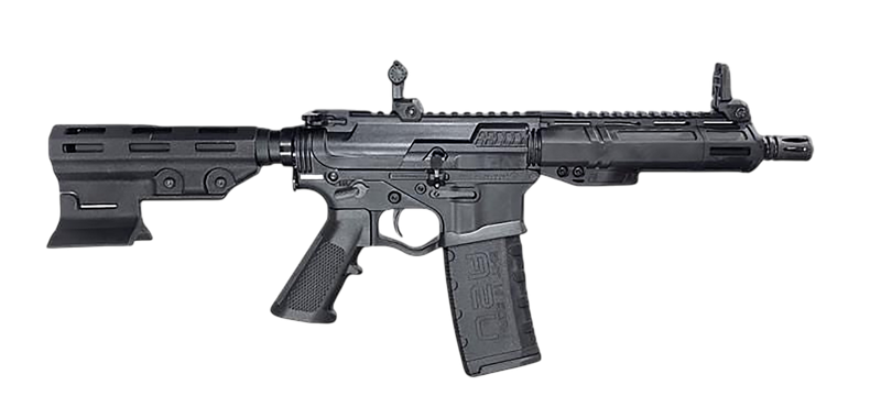 The ATI Alpha Maxx is a 5.56 NATO semi-automatic pistol with a 7.5" threaded barrel and 30+1 round capacity. It features a black polymer receiver with Picatinny rail, M-LOK handguard, A2 grip, polymer blade brace, and flip-up adjustable sights. Overall length is 22" with a weight of 6.95 lbs.