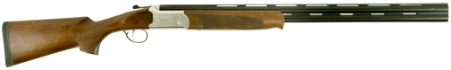 The ATI Cavalry SX is a 20 gauge over/under shotgun with 26" blued 4140 chrome moly steel barrels and 3" chambers. It features a silver engraved 7075 aluminum receiver, oiled Turkish walnut stock, single selective trigger, automatic ejectors, and 5 interchangeable MobilChoke tubes. The shotgun weighs approximately 6.1 lbs with a 43" overall length.
