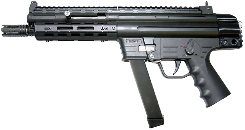 The GSG-9 is a semi-automatic pistol chambered in 9mm Luger with a 7.9" threaded barrel and M-LOK handguard for mounting accessories. It features a 10+1 capacity, accepts Sig P320 and Glock-pattern magazines, and includes fixed sights with Picatinny rails for optics mounting.