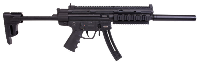 The GSG-16 is a semi-automatic carbine chambered in .22 LR with a 16.25" barrel and 22+1 round capacity. It features a polymer receiver, collapsible synthetic stock with integrated magazine storage compartment, ambidextrous charging handle, adjustable front and rear sights, and a faux suppressor. The rifle weighs 5.84 lbs unloaded with an overall length ranging from 28.5" to 34.25" depending on stock position.
