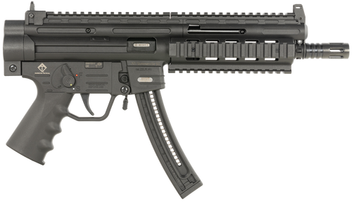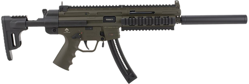 The GSG-16 is a semi-automatic rimfire carbine chambered in .22 LR with a 16.25" barrel and 10+1 round capacity. It features a polymer receiver in Flat Dark Earth, collapsible stock with storage compartment, ambidextrous safety and charging handle, adjustable front and rear sights, and a faux suppressor. This right-hand rifle weighs 5.84 lbs and measures 28.5" to 34.25" overall with M-Lok handguards and Picatinny rails.