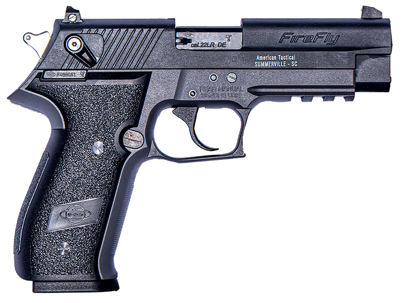 The GSG Firefly is a .22 LR semi-auto pistol with a 4" steel barrel, double/single action trigger, and 10+1 capacity. It features an alloy frame with integrated accessory rail, adjustable 3-dot sights, ambidextrous thumb safety, and black polymer grips. Weighing 24.6 oz with an overall length of approximately 7.2", it's designed for training and sport shooting.
