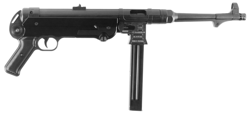 Semi-automatic pistol chambered in 9mm Luger with a 10.8" barrel and 25+1 round capacity. This GSG MP40P is a modern reproduction of the classic WWII MP-40, manufactured to U.S. importation specifications with a metal frame, polymer grips, and fixed sights. Weighs 7.88 lbs with an overall length of 24.5".