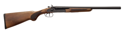 The ATI Road Agent Prime is a break-action, side-by-side shotgun chambered in 20 gauge with a 26" barrel and 2-round capacity. It features a silver engraved aluminum receiver, fixed Turkish walnut stock, and front bead sight. Weighs 6.99 lbs with a 3" chamber.