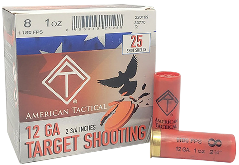 ATI Target Load shotshells are 12 gauge 2.75" rounds loaded with 1 ounce of #8 shot, designed for clay target shooting and range practice. These lead shot loads deliver 1180 fps muzzle velocity and come 25 rounds per box, 10 boxes per case.