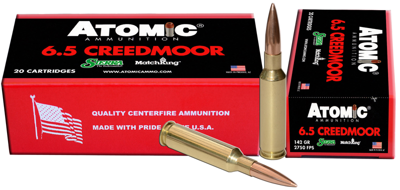 Atomic Match ammunition in 6.5 Creedmoor features 142-grain hollow point bullets loaded to 2750 fps muzzle velocity with 2384 ft-lbs of energy. Designed for target shooting and precision rifle applications, this brass-cased ammunition comes in boxes of 20 rounds with 10 boxes per case.