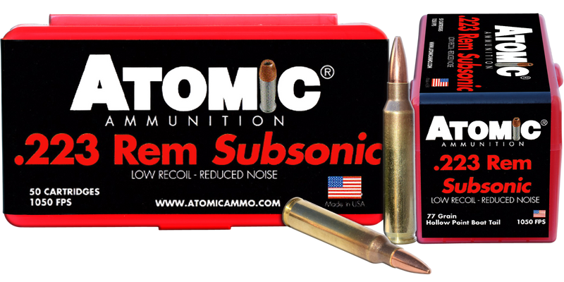 Atomic Ammunition subsonic .223 Remington with 77-grain Hollow Point Boat Tail (HPBT) bullets loaded to 1050 fps for reduced-noise tactical use and target practice. 50 rounds per box, 10 boxes per case. Brass casing with 188 ft-lbs muzzle energy.