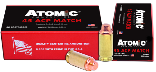 Atomic Match Precision Craft ammunition in 38 Special features a 148-grain hollow base wadcutter bullet design optimized for target shooting. This round delivers 800 fps muzzle velocity and 210 ft-lbs of energy with brass casing. Each box contains 50 rounds, with 10 boxes per case.