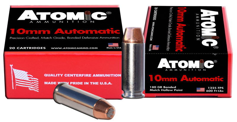 Atomic Ammunition 10mm Auto centerfire handgun rounds with 180-grain bonded match hollow point bullets. Features nickel-plated brass casings, 1225 fps muzzle velocity, and 600 ft-lbs muzzle energy. Packaged 20 rounds per box, 10 boxes per case, suitable for home defense applications.
