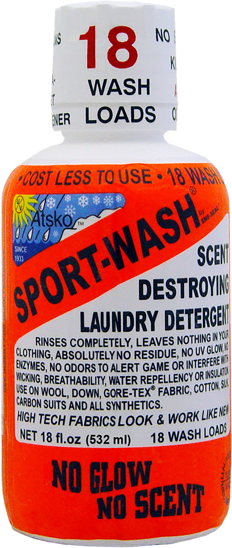 Sport Wash is an unscented laundry detergent specifically formulated for hunting apparel and gear. This 18-ounce bottle provides 18 loads and is designed to remove human scent from clothing without leaving artificial odors that could alert game. Ideal for hunters preparing scent-control clothing systems.