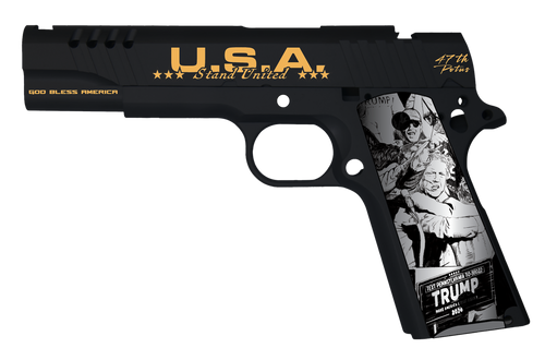 Semi-auto single action .45 ACP handgun with 5" stainless steel barrel and 7+1 round capacity. Features Northern Lights Cerakote finish on steel frame with Armor Black Cerakote engraved aluminum grips, serrated stainless steel slide with decorative cuts, extended beavertail grip safety, and 3-dot combat day sights.