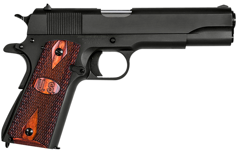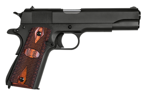 Single-action semi-automatic pistol chambered in .45 ACP with a 5" stainless steel barrel and matte black carbon steel slide and frame. Features a beavertail grip safety, thumb safety, firing pin block safety, checkered wood grips with integrated US logo, blade front sight with drift-adjustable rear sight, and includes one 7-round magazine. Weighs 39 oz with an overall length of 8.5 inches.