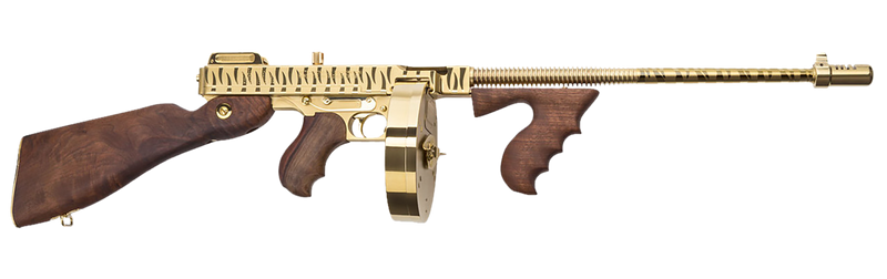Thompson 1927A-1 Deluxe semi-automatic rifle chambered in .45 ACP with a 16.5" finned barrel and compensator. Features adjustable rear and blade front sights, American walnut stock with vertical foregrip, and titanium gold plating with tiger stripe finish. Includes one 20-round stick magazine and one 50-round drum magazine; weighs 13 lbs.
