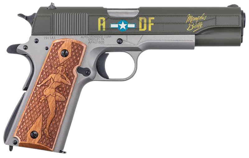 Semi-automatic 1911-style handgun chambered in 45 ACP with a 5" stainless steel barrel and 7+1 capacity. Features OD Green Cerakote serrated slide, Gray Cerakote steel frame with beavertail grip safety, custom engraved wood grips, and fixed blade front/drift adjustable rear sights. This Memphis Belle special edition pays tribute to the legendary WWII B-17F bomber and weighs 39 oz.