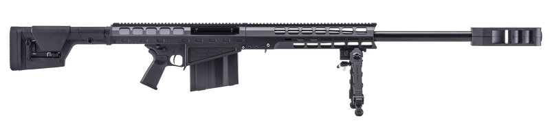 The TAO50 is a bolt-action .50 BMG rifle featuring a 29" barrel with 1:15 twist and high-efficiency muzzle brake. It includes a Magpul PRS Gen3 adjustable stock, MOE+ grip, Timney AR-style trigger, ambidextrous safety, Picatinny rails, and an Accu-Tac bipod, with an overall length of 61" and weight of 25.5 lbs. Compatible with Barrett M107A1 magazines and ships with a custom hardcase.