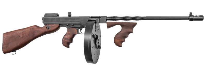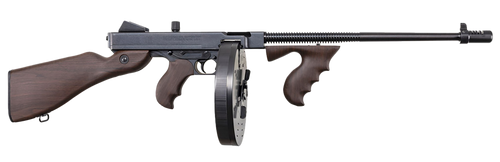 Semi-automatic rifle chambered in .45 ACP with a 16.5" finned barrel and compensator (18" total length). Features adjustable rear and blade front sights, American walnut fixed stock and vertical foregrip, and accepts both 20-round stick magazines and 100-round drum magazines. Weighs 13 lbs with an overall length of 41 inches.