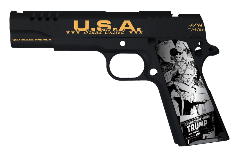 Semi-automatic 1911 pistol chambered in .45 ACP with a 5" barrel and 7+1 round capacity. Features a stainless steel frame with graphite black and gold cerakote finish, custom engraved aluminum grips, skeletonized trigger, and TruGlo white 3-dot sights. Limited edition Trump Fight design with patriotic engravings on the slide.