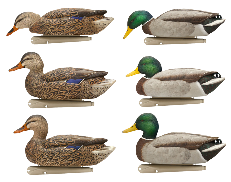 This 6-pack of mallard decoys features six unique postures that realistically depict natural mallard behavior on water. Ultra-realistic paint schemes with superior adhesion and durability are combined with an innovative weight-forward swim keel design that allows natural motion when snapped to a line. The decoys measure approximately 18.8" L x 16.1" W x 12.9" H.