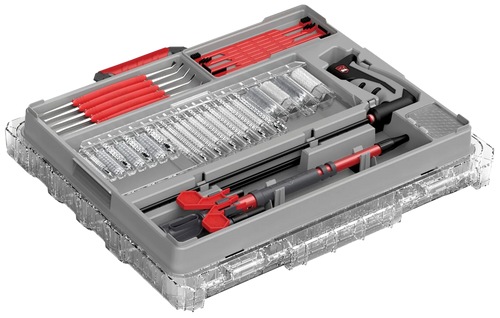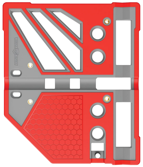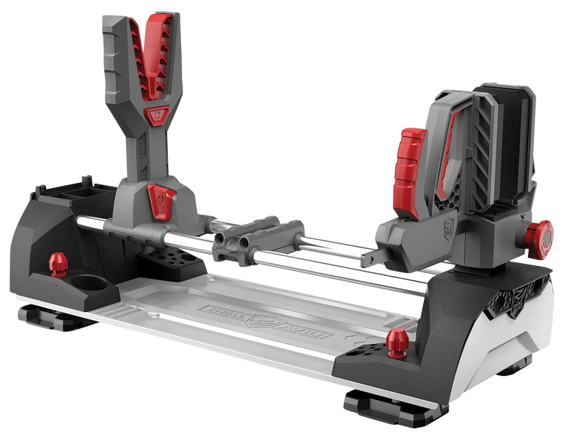 A table-top clamping vise designed for securing long guns during gunsmithing and maintenance work. Features a gray and red color scheme with adjustable clamping surfaces. Ideal for gunsmiths and serious gun enthusiasts who need stable work support for detailed firearm projects.