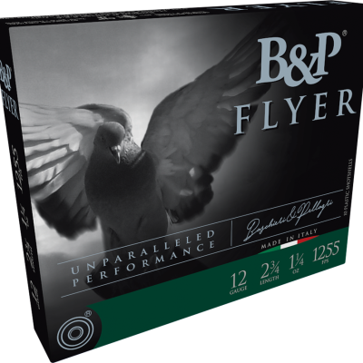 B&P Competition Flyer 12 gauge shotshell features a 1 1/4 oz #8 shot load in a 2.75" shell, optimized for clay target and competition shooting. The ammunition delivers 1255 fps muzzle velocity and is engineered for improved shot patterns and consistent performance in competitive shotgun sports.
