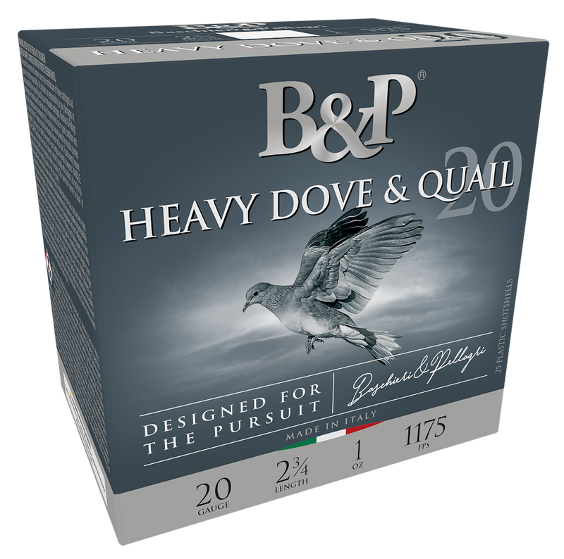 B&P Heavy Dove & Quail shotshells in 20 gauge, 2.75" length with 1 oz of #8 lead shot. Loaded to 1175 fps, these low brass rounds are designed for hunting dove and quail with effective spread and pattern efficiency.