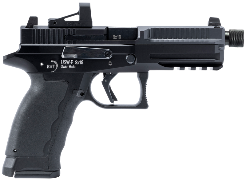 The B&T USW-P is a 9mm Luger striker-fired semi-automatic pistol with a 4.9" threaded barrel and 17+1 round capacity. Features include an optic-cut slide, Picatinny rail frame, ambidextrous safety, and contrast suppressor height sights. The pistol weighs 1.99 lbs and is finished in serrated black anodized aluminum with a black rubber overmolded grip.