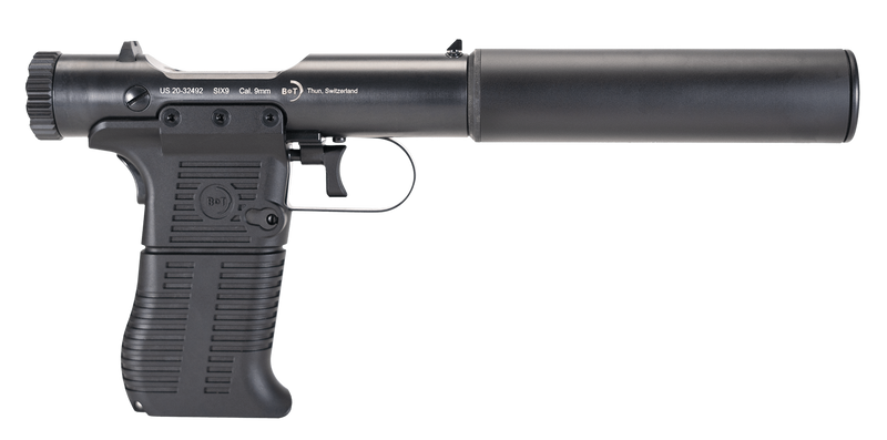 The B&T Station Six is a 9mm bolt-action pistol featuring a 3.5" barrel with an integrated 5.10" suppressor for a total length of 11.3". It has a 9+1 capacity, accepts standard 1911 magazines, and weighs 1.9 lbs. This integrally suppressed design traces its heritage to the WWII Welrod and modern VP9, delivering a quiet signature with a unique rotating bolt operation.