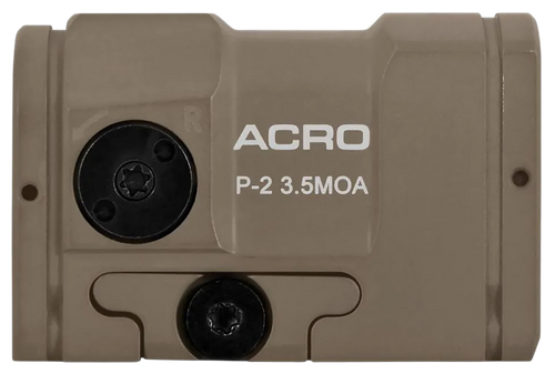The Aimpoint ACRO P-2 is a 1x fixed magnification red dot sight with a 3.5 MOA dot and unlimited eye relief. It features a fully enclosed design with hardened front and rear glass lenses, multi-layer optic coating, and a 5-year battery runtime with CR2032 battery. The sight is tested to withstand 20,000 rounds of .40 S&W and includes flush-mounted windage and elevation knobs with audible tactile clicks.