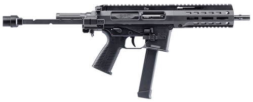 Semi-automatic pistol chambered in 9mm Luger with a 9.1" barrel and 33+1 round capacity using Glock-compatible magazines. Features an optic-ready slide with Picatinny rail, ambidextrous safety, threaded barrel, and buffer tube stock. Weighs 5.90 lbs and incorporates B&T's hydraulic buffer system for reduced recoil.
