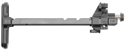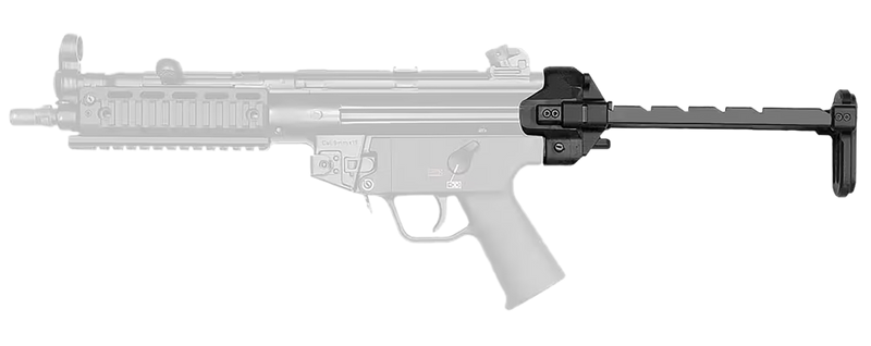 This is a telescoping collapsible stock designed for H&K MP5 and SP5 firearms. Constructed from aluminum and steel with a matte black finish, it features a retractable design that allows the operator to adjust length of pull. Installation is direct-fit to MP5 platform weapons.