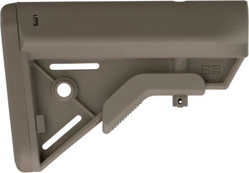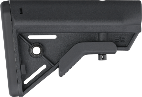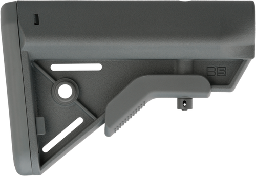 The B5 Systems Bravo is a lightweight, compact collapsible buttstock designed for AR-15 platform rifles with mil-spec receiver extensions. It features a raised cheek piece, quick-detach sling mount, anti-rotation design, and Sure Grip texture for secure handling. The stock is made of polymer and does not include a buffer tube.