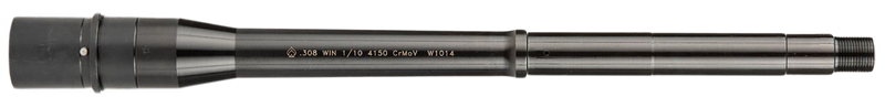 This is a 12.5" carbine length barrel chambered in 308 Winchester with a 1:10 twist rate, designed for AR-10 platforms. The barrel features a tactical government profile, 4150 chrome-moly-vanadium steel construction, QPQ corrosion-resistant finish, and 5/8x24 threads for muzzle device attachment.
