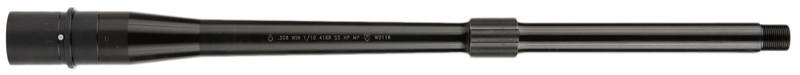 This is a 16-inch .308 Winchester barrel with a Hanson profile and midlength gas system, designed for AR-10 platforms. The barrel features QPQ black finish on 4150 chrome moly vanadium steel construction and comes with a low profile gas block. The threaded muzzle end allows compatibility with standard suppressors and muzzle devices.