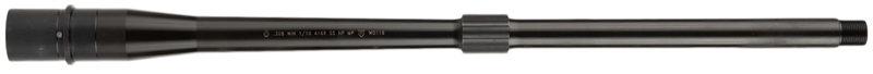 This is a .308 Winchester AR-10 compatible barrel featuring an 18" Hanson profile with midlength gas system and integrated low-profile gas block. The barrel is constructed from 4150 chrome moly vanadium steel with a QPQ black finish for corrosion resistance. The muzzle is threaded and the barrel has a 1:10" twist rate suitable for standard .308 ammunition.