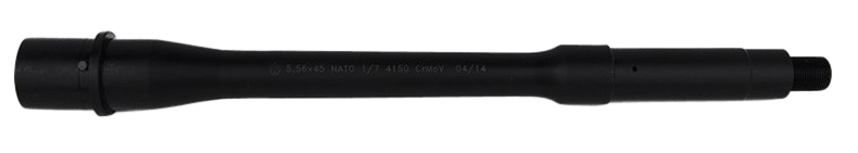This is a rifle barrel chambered in 5.56 NATO/.223 Remington with a 10.5" carbine-length profile designed for AR-15 compatibility. It features a 1:7 twist rate, 1/2x28 threaded muzzle, QPQ corrosion-resistant finish, and 4150 CrMoV steel construction with carbine-length gas system.