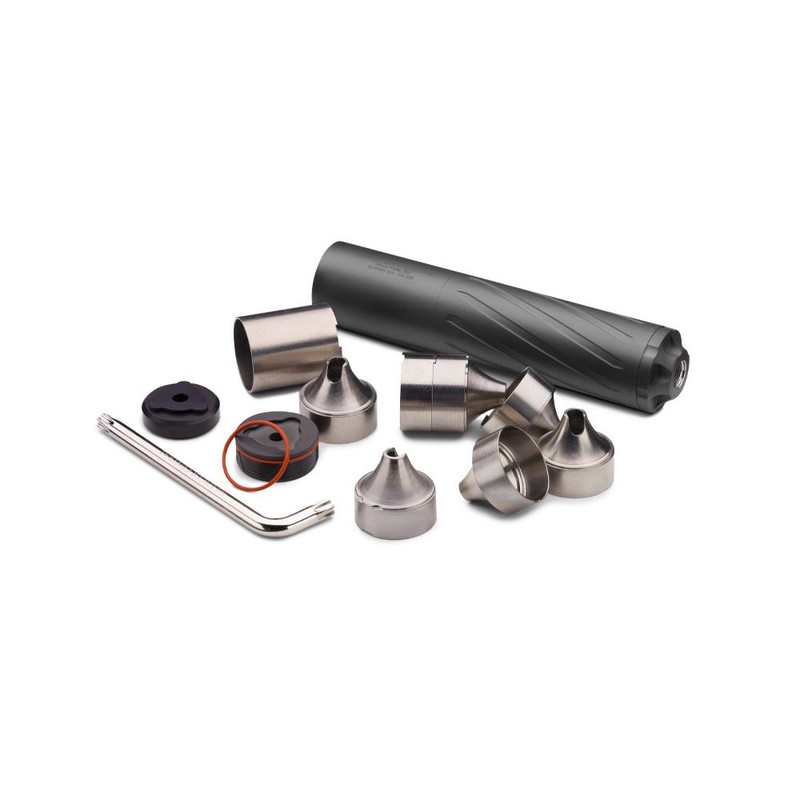 The Banish 223 is a direct-thread suppressor chambered for .223 Remington/5.56 NATO with a 7-inch length and 1.5-inch diameter, constructed from lightweight titanium weighing 11.4 ounces. It features seven titanium baffles providing 34 dB of sound reduction and is rated for limited full-auto fire. The suppressor mounts via 1/2x28 threads and is user-serviceable.