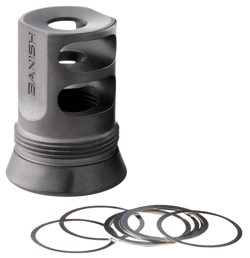 This is a muzzle brake accessory designed for the Banish 30 Gold suppressor, allowing quick thread pattern changes across different host firearms. Constructed from titanium with a black finish, it features a 1/2x28 thread pitch and includes a shim kit for optimal fitment. The muzzle brake enables suppressor installation on .30 caliber rifles with compatible threading.