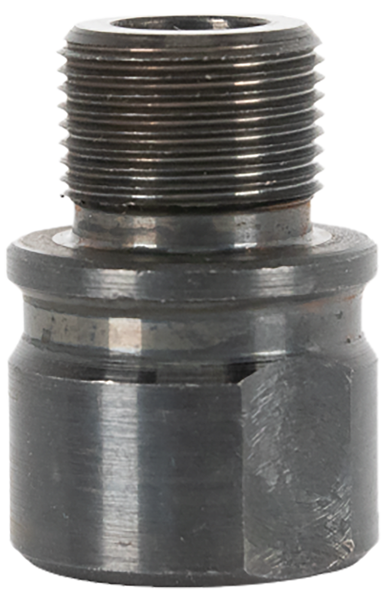 This thread adapter allows mounting of 5/8-24 RH muzzle devices to barrels with M13x0.75 RH thread patterns. Machined steel construction with black oxide finish, featuring two large flats for secure installation and a preserved front shoulder for proper alignment of muzzle devices. Compatible with 7.62/.30 caliber and smaller rounds.