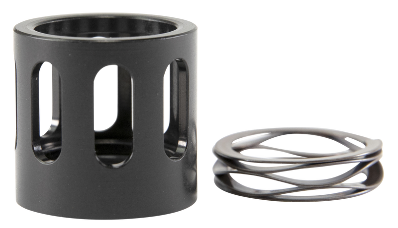 This fixed barrel spacer is designed for the Banish 45 suppressor and replaces the spring inside the Nielsen device for use on fixed barrel firearms only. It is commonly used on hosts such as pistol caliber carbines and subguns including the Sig MPX, CZ Scorpion, and Kriss Vector. The spacer features black anodized aluminum construction with dimensions of approximately 4.9" length x 2.9" width x 1.2" height.
