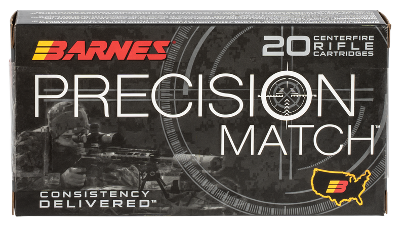 Barnes Precision Match ammunition in 6mm Creedmoor with 112 grain Open Tip Match Boat Tail bullets designed for target shooting applications. This ammunition features brass casing and delivers a muzzle velocity of 2960 fps with 2180 ft lbs of energy. Sold in 20-round boxes with 10 boxes per case.