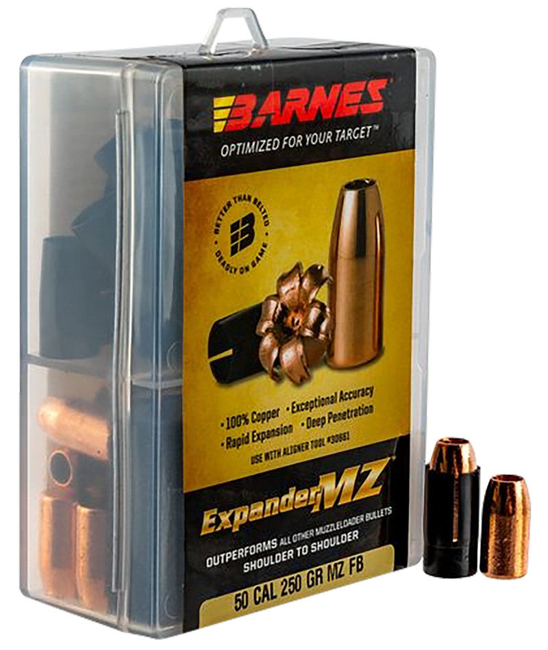 Barnes Expander MZ bullets are 100% copper hollow point rounds designed for .50 caliber muzzleloading rifles, expanding to twice their original diameter to create six razor-sharp cutting petals. These lead-free bullets deliver 300 grains of weight with full weight retention and no fragmentation, performing effectively at both high and low velocities. Fifteen rounds per box with included sabot.