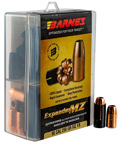 Barnes Expander MZ bullets are .50 caliber muzzleloader projectiles with sabots designed for hunting applications. Each bullet weighs 300 grains, features a hollow point design, and expands to twice the original diameter for increased stopping power. The box contains 24 rounds and is constructed from copper material for reliable performance at both low and high velocities.