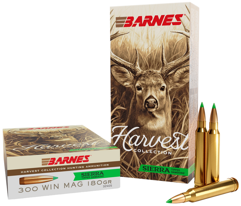 Barnes Harvest Collection centerfire rifle ammunition in 300 Winchester Magnum with 180-grain Sierra Tipped GameKing bullets. Delivers 2960 fps muzzle velocity and 3503 ft-lbs of energy from boxer-primed, reloadable brass cases. Designed for thin-skinned game hunting with Barnes' terminal performance standards.