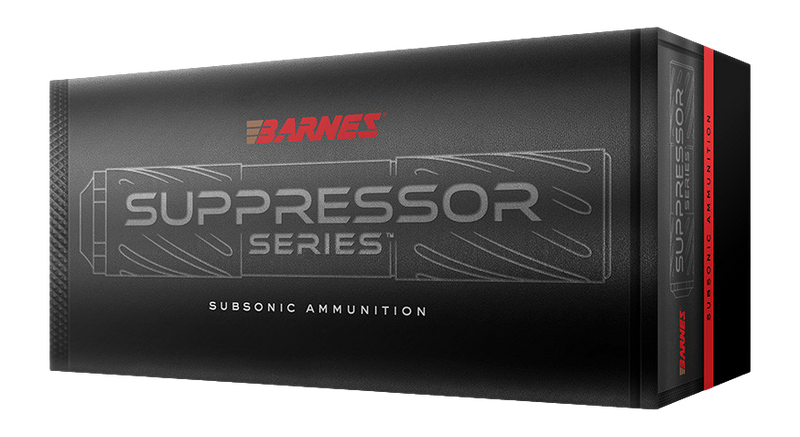 Barnes Suppressor Series subsonic rifle ammunition in 308 Winchester with 205-grain Sierra GameKing projectiles. Optimized for suppressed firearms with clean-burning propellants and designed to expand reliably at subsonic velocities (1060 fps). Loaded to exacting standards with boxer primers and brass cases.