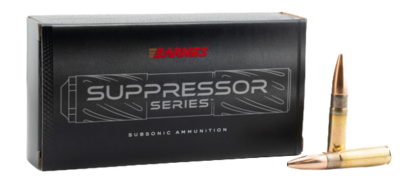 Barnes Suppressor Optimized ammunition in .300 Blackout with 205-grain Sierra GameKing bullets designed for subsonic performance at 1060 fps. Features clean-burning propellants to reduce gas blowback and cycling issues in semi-auto platforms. Delivers dependable expansion and quieter performance through suppressor-equipped firearms.
