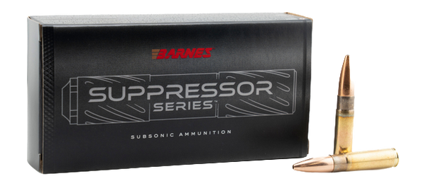 Barnes Suppressor Series subsonic ammunition in .300 Blackout with 220-grain Sierra MatchKing hollow point bullets, loaded to 1060 fps. Purpose-built for suppressor use with clean-burning propellants to reduce gas blowback and improve cycling in semi-auto platforms. Comes 20 rounds per box, 10 boxes per case.